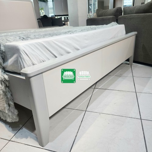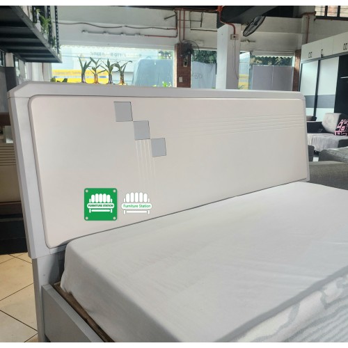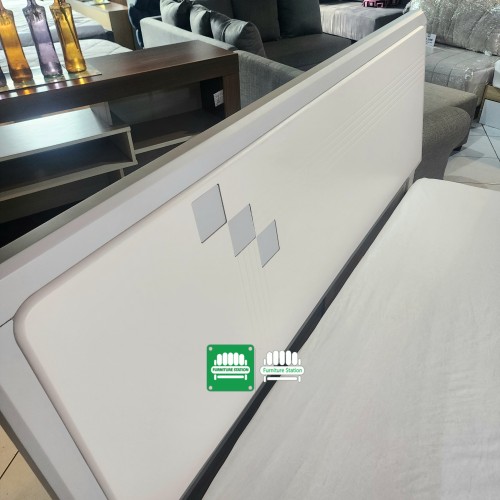 The sleek headboard features subtle geometric accents for a contemporary touch, while the smooth matte finish in light gray and white enhances its calm, airy aesthetic. Supported by sturdy legs and crafted from durable engineered wood, this bed offers both style and long-lasting stability.