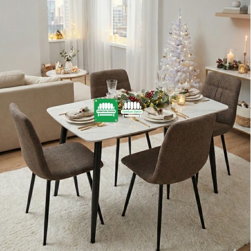 The Kinsley Dining Set effortlessly brings modern elegance and comfort to your dining area. Perfectly sized for cozy dinners or casual entertaining, this 5-piece collection features a sleek, sophisticated table paired with four supportive, upholstered chairs.