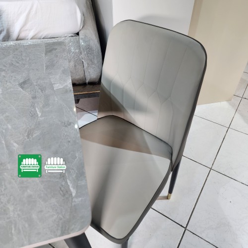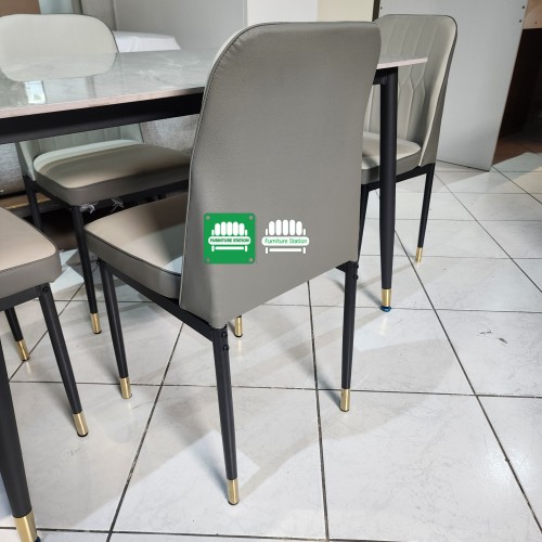 At the heart of the set is a stunning rectangular table featuring a durable, marble-patterned/look  Sintered stone top. Its smooth, cool grey surface is resistant to heat and scratches, making it as practical as it is beautiful. The table rests on sleek, tapered black legs finished with brushed gold ferrules, adding a subtle touch of glamour to your space.