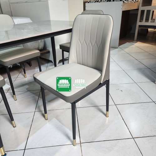 The matching chairs are upholstered in premium, soft-touch grey eco-leather. The backrests feature elegant vertical channel tufting and a gentle ergonomic curve that hugs your back for maximum comfort during long dinner conversations. Like the table, the chairs feature matching black and gold-tipped legs for a cohesive, designer look.