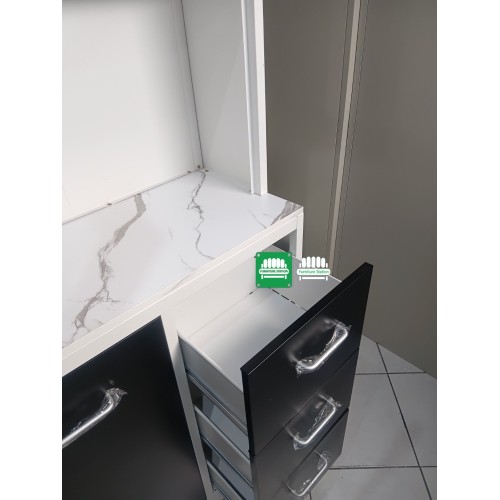Modern Aesthetic: A crisp white frame paired with bold matte black doors and elegant silver handles, creating a minimalist look that complements any condo or contemporary kitchen.
