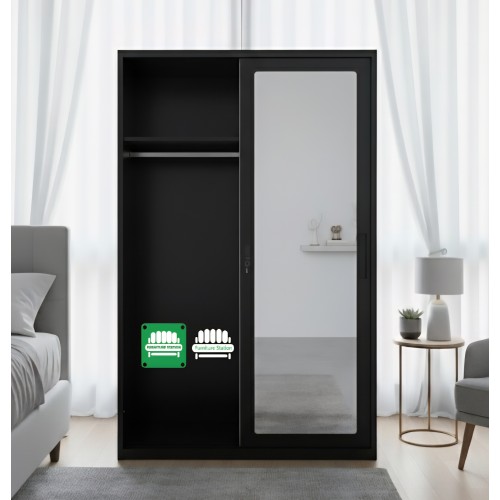 • ​Full-Length Mirror: One door is a sleek, integrated full-length mirror, adding depth to your room and providing a convenient dressing area.
