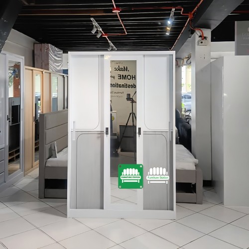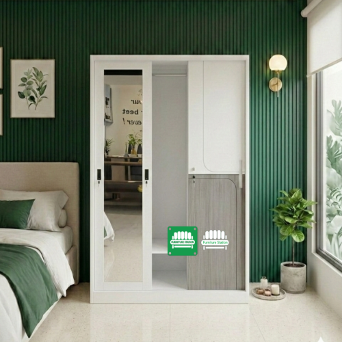 Elevate your bedroom with the Cresta Sliding Wardrobe, a centerpiece designed for those who value sleek minimalism without sacrificing storage. Featuring a unique tri-panel sliding system, this wardrobe blends crisp matte white surfaces with sophisticated grey wood-grain accents, framed in our signature high-grade, all-metal construction.
