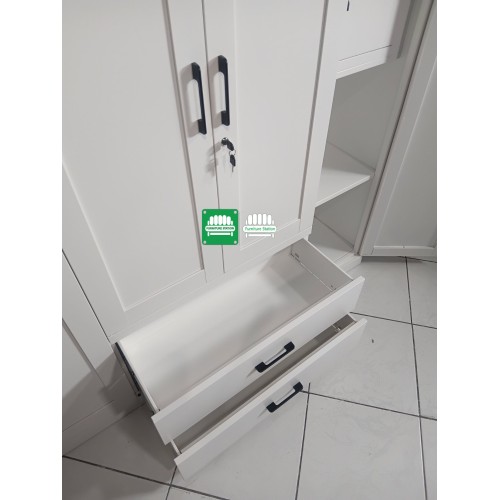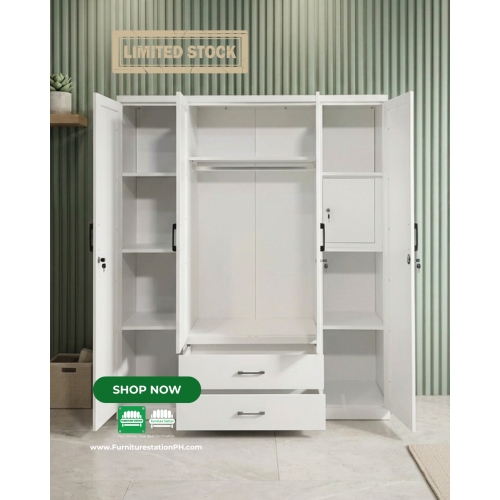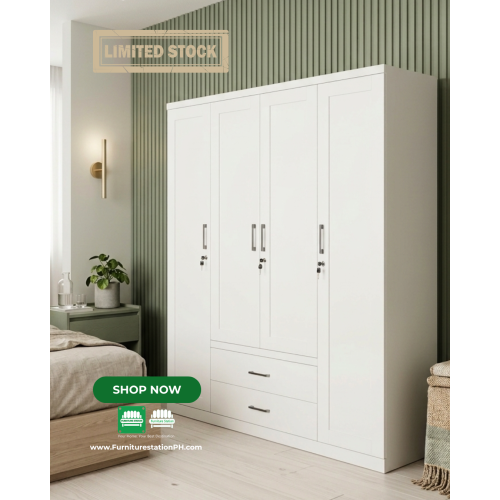 This all-in-one storage solution provides ample space for your entire wardrobe. With four secure doors and two wide bottom drawers, it balances hanging space with easy-access storage for folded items, linens, or accessories.