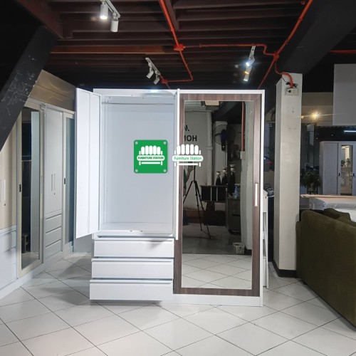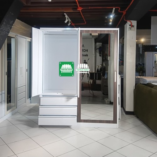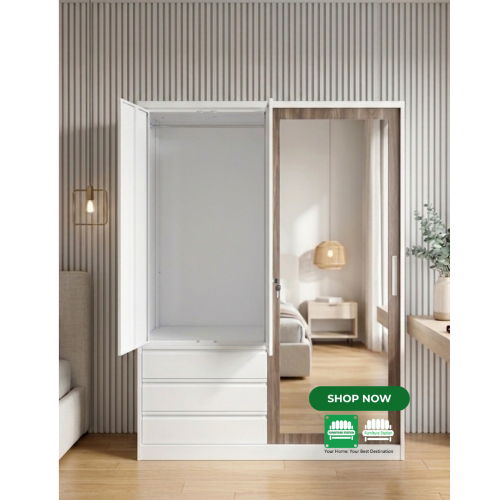 Inside, you’ll find a spacious hanging area for clothes, multiple compartments for folded garments, and three drawers for essentials — all built in durable powder-coated steel for long-lasting strength.